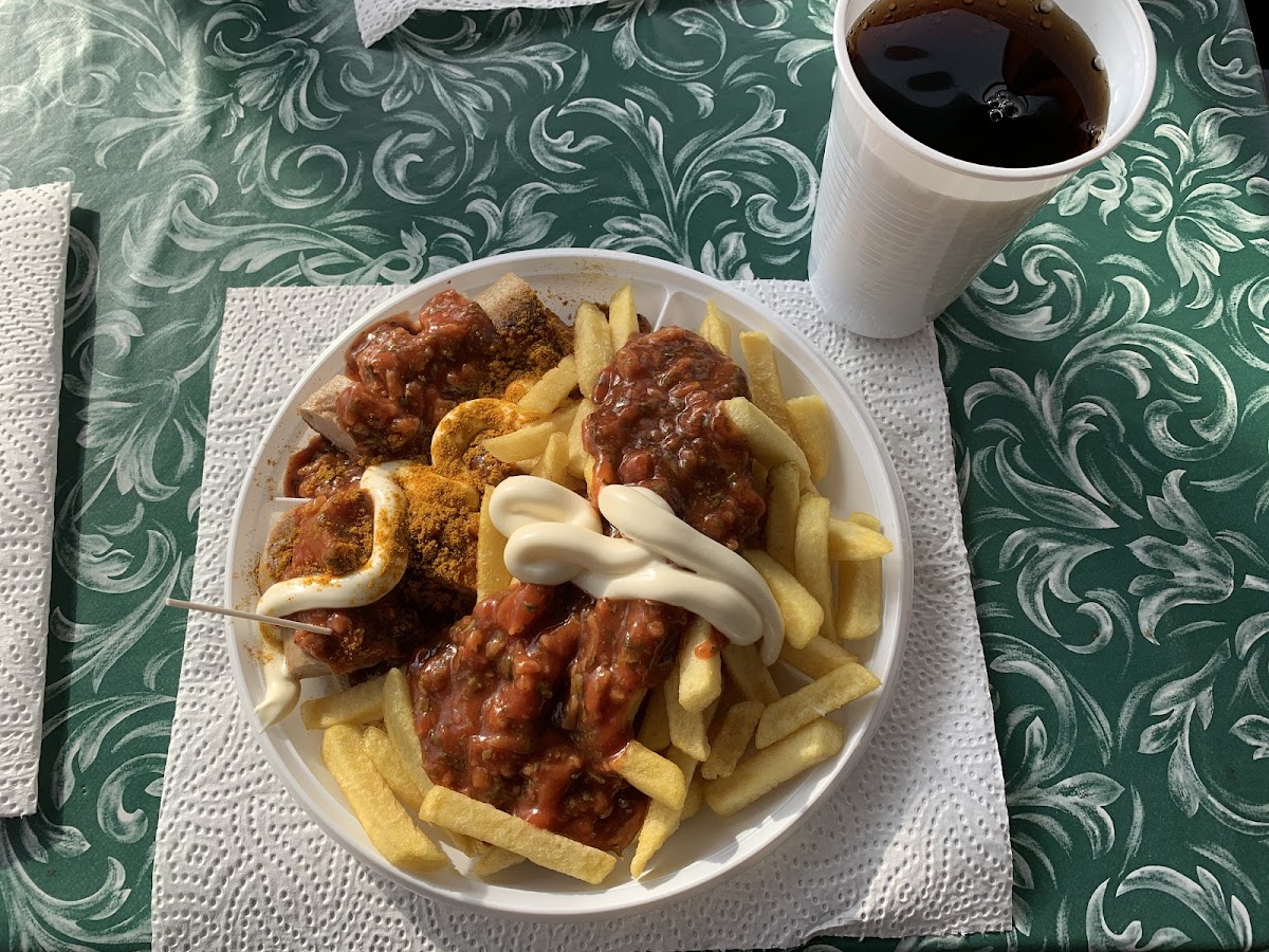 Leckere frische Currywurst, Rote, Schnitzel und Pommes. Dazu gibt es eine leckere, hausgemachte Spezialsoße von nicht scharf bis richtig scharf. Alternativ bekommt man seine Wurst auch mit Heinz Ketchup. Die Inhaber sind immer freundlich und nett. Viele Stammkunden kommen regelmäßig her. Im Winter ist das Zelt beheizt.
